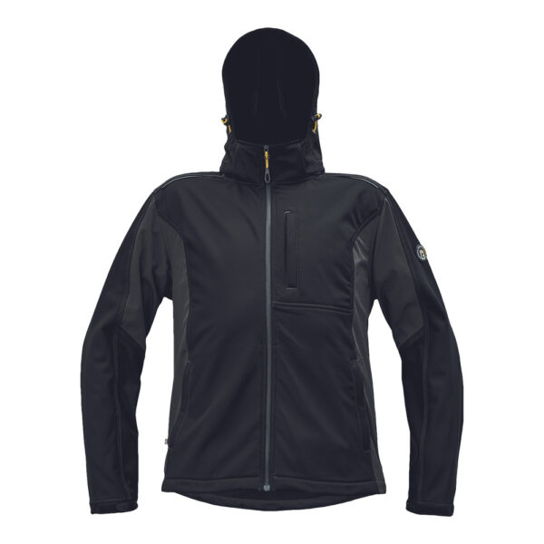 Description: men’s sofsthell jacket with detachable hood » 3 zipper front pockets, 2 inside pockets » adjustable sleeve with plastic velcro strap, adjustable draw string in bottom » reflective details.