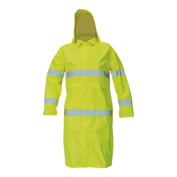 Description: men’s lightweight HI-VIS waterproof coat with an integrated hood and reflective stripes » high water resistance and permeability » zipper closure with velcro flap cover » sleeves with inner elastic cuffs » 2 front pockets with flaps » underarms and back ventilation » taped seams » prolonged length 110 cm.