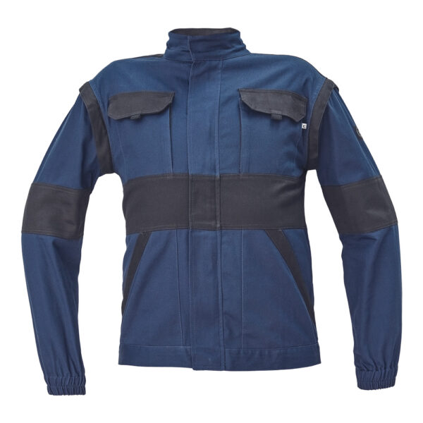 Description: men´s working jacket with zipper closure and placket cover » detachable sleeves » 2 front pockets, 2 chest pockets » reinforcement in stressed parts of shoulders and elbows » elastic cuffs and bottom waist hem.