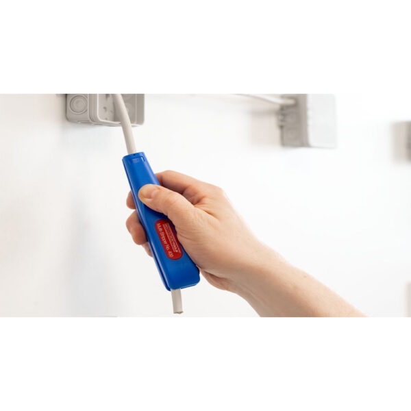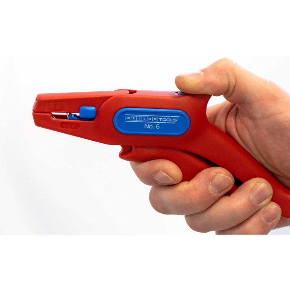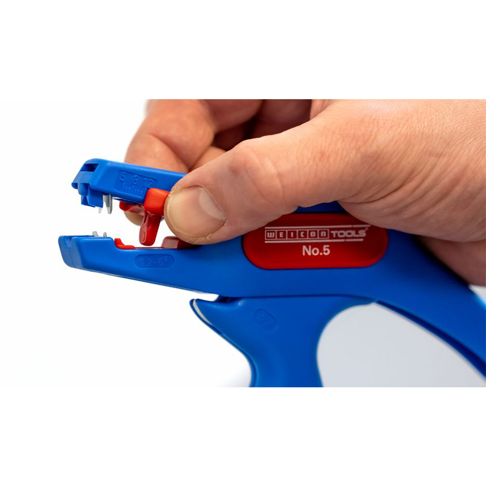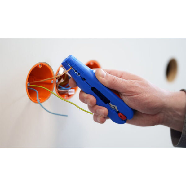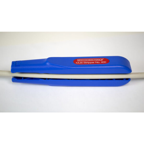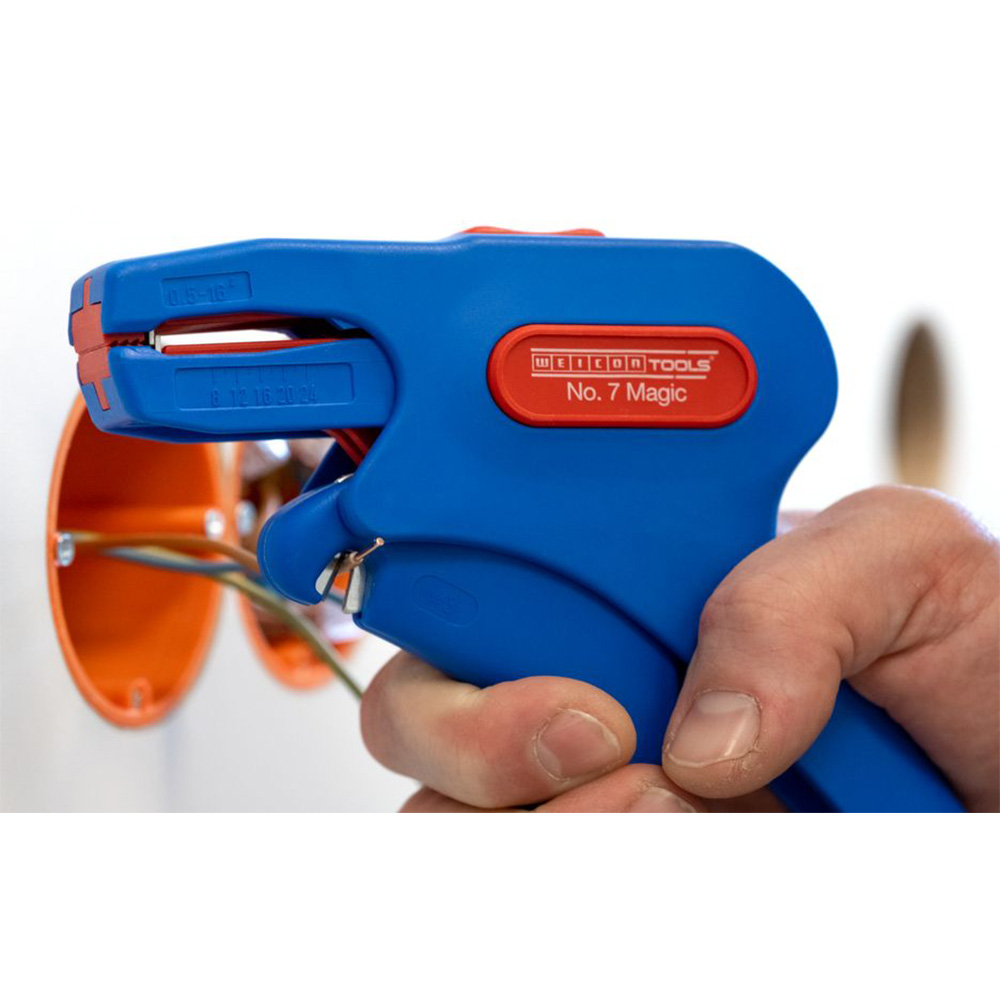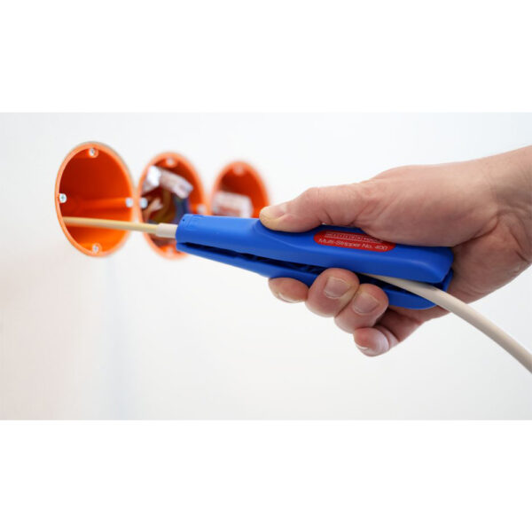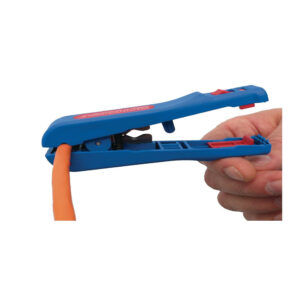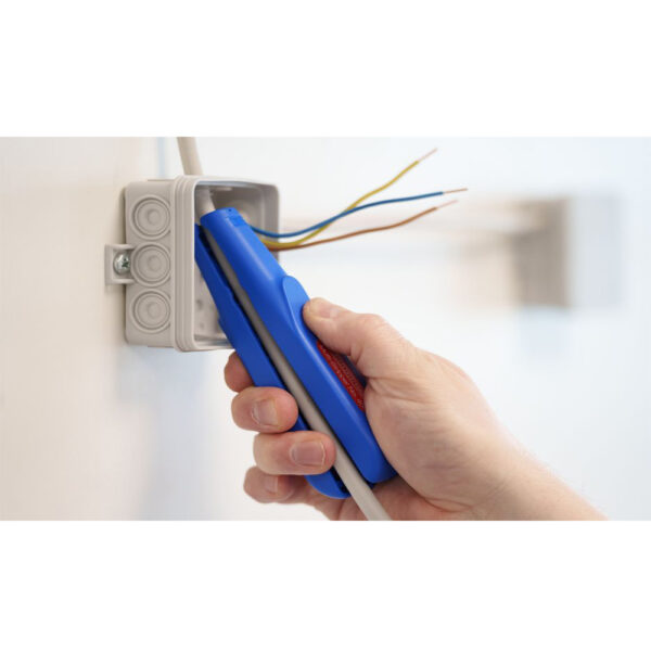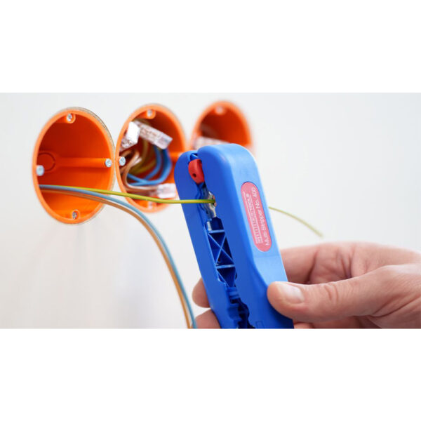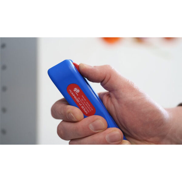 WEICON Multi-Stripper No. 400, a universal stripping tool for the functions: circular cutting – longitudinal cutting – stripping – cutting. With this tool, cables can be stripped easily even in places that are difficult to access, e.g. in ceilings and walls, in junction and distribution boxes, switch cabinets. The contour blade can be used to strip the conductor cross-sections 0.5 mm², 0.75 mm², 1.5 mm², 2.5 mm², 4.0 mm² and 6.0 mm². The multi-stripper impresses with its handy design and wide range of uses.