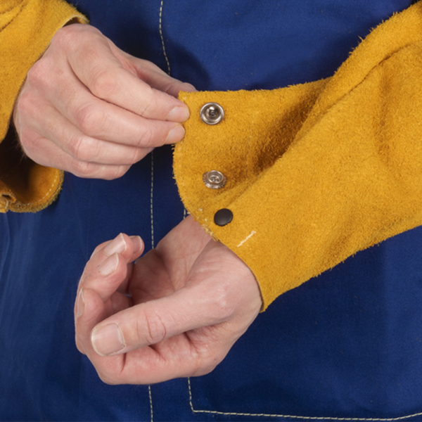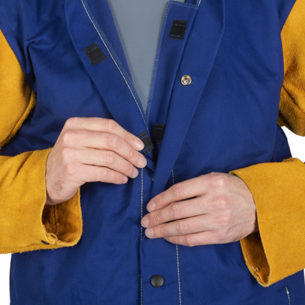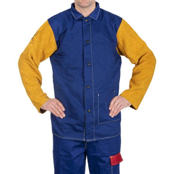 Yellowjacket® blue flame retardant welding jacket with cotton body and yellow split cowleather leather sleeves