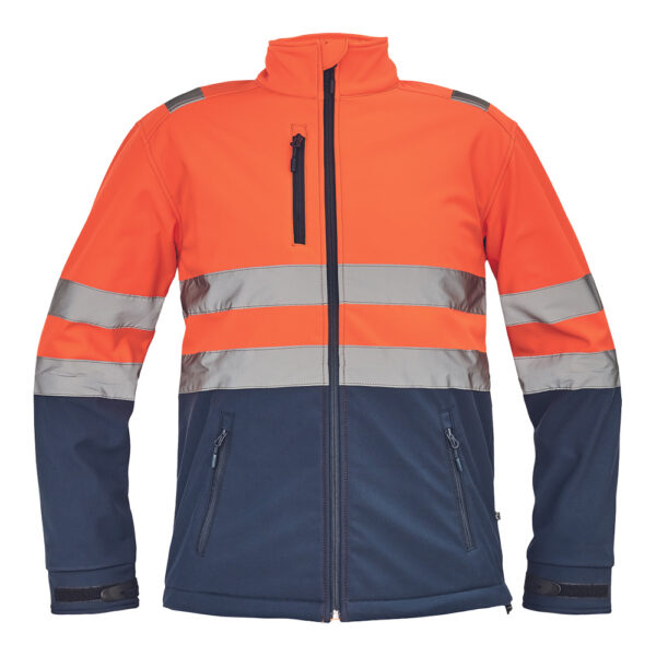 Description: men’s HI-VIS sofsthell jacket with breathable TPU water resistant membrane; reflective stripes across shoulders and around sleeves and hip part; zip fastening; 1 chest and 2 side zipper pockets; velcro sleeve closing and draw string in the bottom;