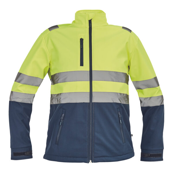 Description: men’s HI-VIS sofsthell jacket with breathable TPU water resistant membrane; reflective stripes across shoulders and around sleeves and hip part; zip fastening; 1 chest and 2 side zipper pockets; velcro sleeve closing and draw string in the bottom;